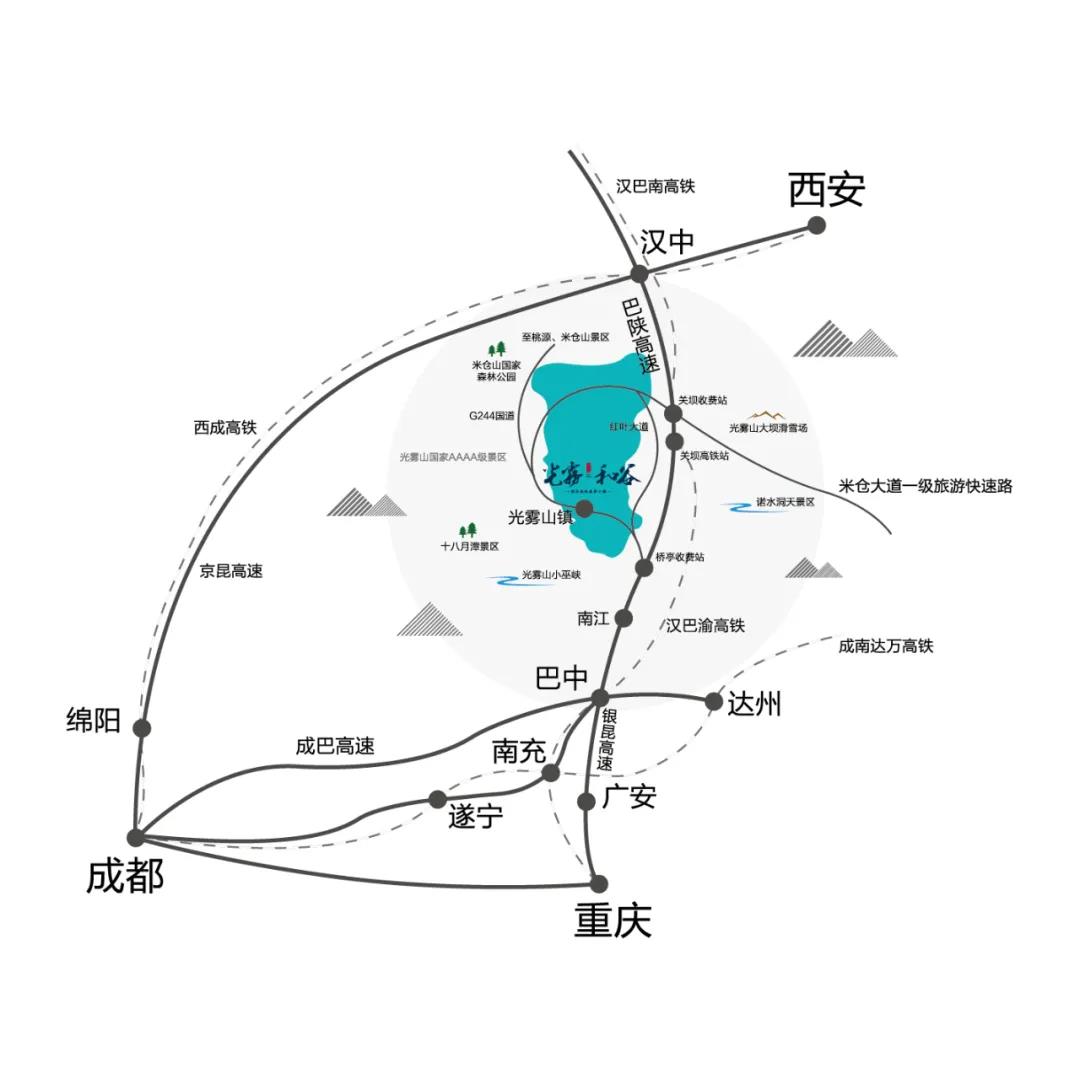 酒店位于四川·巴中市的光霧山鎮(zhèn)——光霧和谷國(guó)際森林康養(yǎng)小鎮(zhèn)。背靠光霧山AAAA級(jí)風(fēng)景名勝,周邊緊密分布著米倉(cāng)山國(guó)家森林公園、光霧山-諾水河世界地質(zhì)公園、小巫峽、恩陽古鎮(zhèn)、十八月潭等景區(qū)。隨著米倉(cāng)大道旅游快速路快速建成,這里將成為光霧山度假區(qū)中心樞紐,賓客們?cè)谶@能包攬自然風(fēng)光,享受完美旅游度假生活。