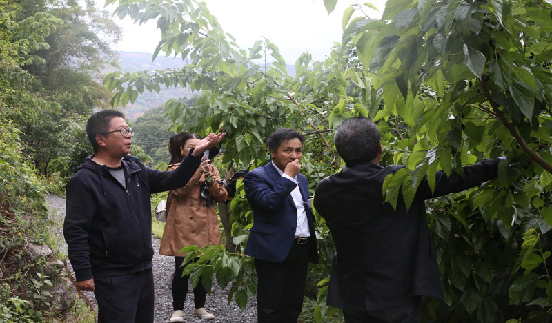 在果園林蔭小道,苗主席和王院長(zhǎng)興致勃勃地體驗(yàn)了桑葚采摘,在細(xì)細(xì)品嘗后對(duì)香甜的水果贊不絕口。