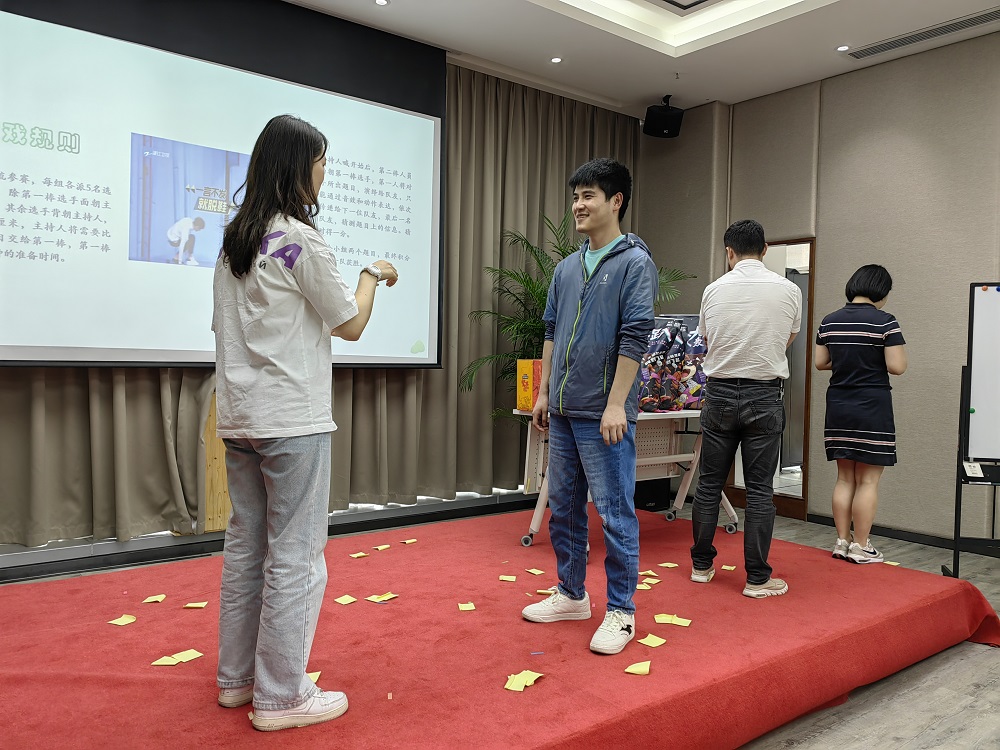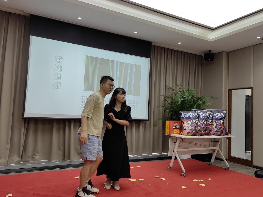 第二個(gè)環(huán)節(jié)是趣味游戲環(huán)節(jié),游戲方式主要取自當(dāng)下熱門娛樂節(jié)目《王牌對(duì)王牌》的經(jīng)典游戲,結(jié)合公司實(shí)際,進(jìn)行適當(dāng)演變而成,內(nèi)容包括“一起搖擺、‘心’火相傳、穿越‘火線’、慧眼識(shí)‘珠’、妙筆生花、火眼‘金’睛”等,均為競(jìng)技類項(xiàng)目。參與人員隨機(jī)組成兩個(gè)小組進(jìn)行PK,由工作人員在每輪游戲中對(duì)完成時(shí)間和完成結(jié)果兩個(gè)維度進(jìn)行綜合測(cè)評(píng),最終評(píng)選出優(yōu)勝組獲得工會(huì)精心準(zhǔn)備的零食大禮包。